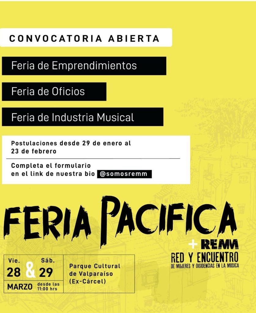 La Feria Pacífica busca generar espacios de conexión entre artistas, emprendedoras y agentes de oficios relacionados con la música, fomentando la colaboración, el intercambio de conocimientos y la proyección nacional e internacional de proyectos liderados por mujeres y disidencias. La idea es generar networking con artistas, gestoras, sellos y otros agentes del sector musical. Para más información puedes revisar nuestras redes sociales y rellenar el formulario acá.