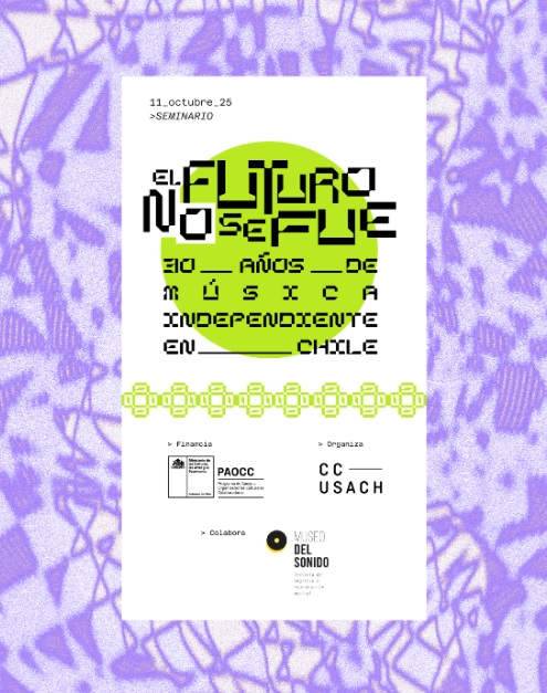 El próximo sábado 11 de octubre el Museo del Sonido será sede del Seminario El Futuro No Se Fue: 30 años de música independiente en Chile, una jornada de reflexión, memoria y música en vivo organizada por la Corporación Cultural Usach en co-producción con Sebastián Sampieri, que reúne a artistas, periodistas, investigadores, gestores y un historiador, en torno a la historia y proyección de la escena independiente en Chile.